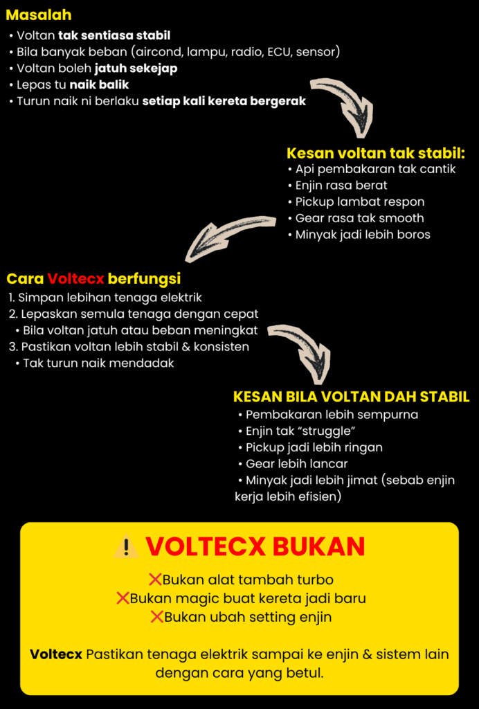 Voltecx adalah untuk kenderaan bawah 2.0 cc seperti kereta. Manakala Voltecx Max untuk kenderaan berat atau 2.0 cc keatas seperti lori/bas